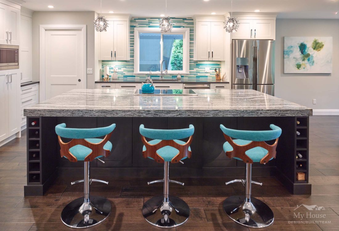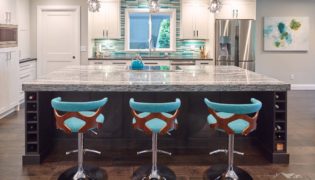 As the homeowners love to cook, every inch of the kitchen was thoroughly considered. The kitchen cabinets extend floor-to-ceiling, providing ample storage for food and to hide away unused small appliances. The extra large kitchen island features built in wine shelves, cabinet storage, basket drawers for fruit, and barstool seating for three – comfortably. With the refrigerator and built in microwave located at one end, the kids can quickly grab items without interrupting Mom and Dad. To tie in with the rest of the home, caribbean blue was injected in the backsplash and bar stools.