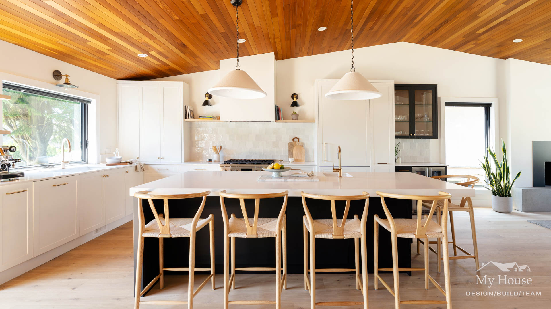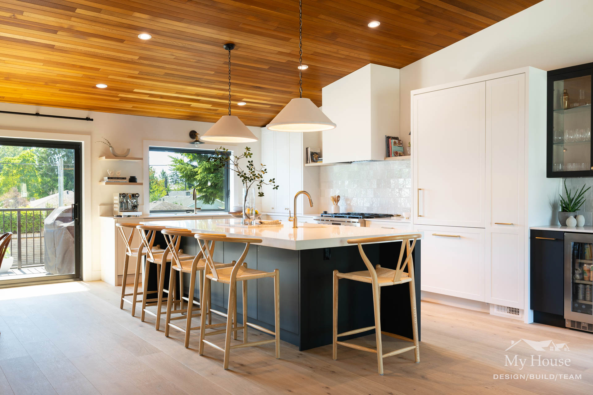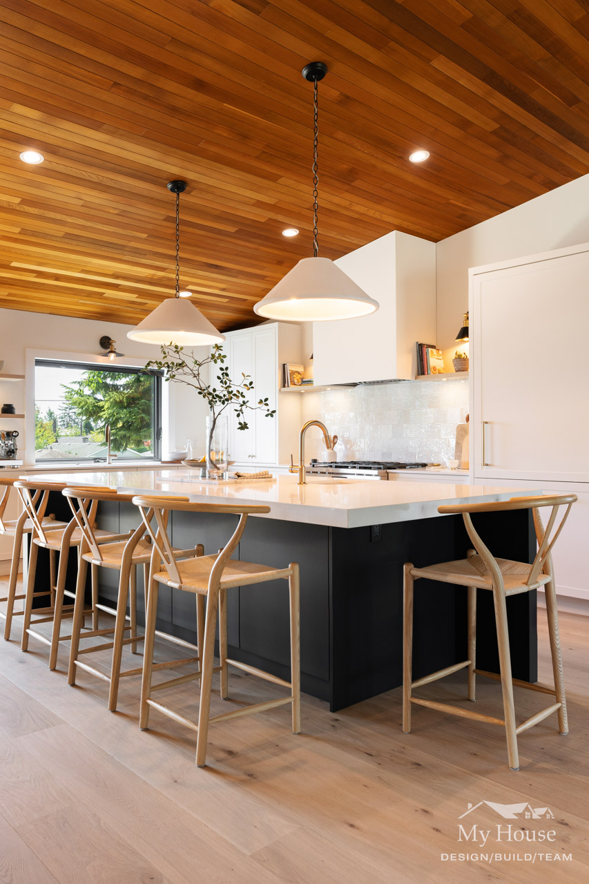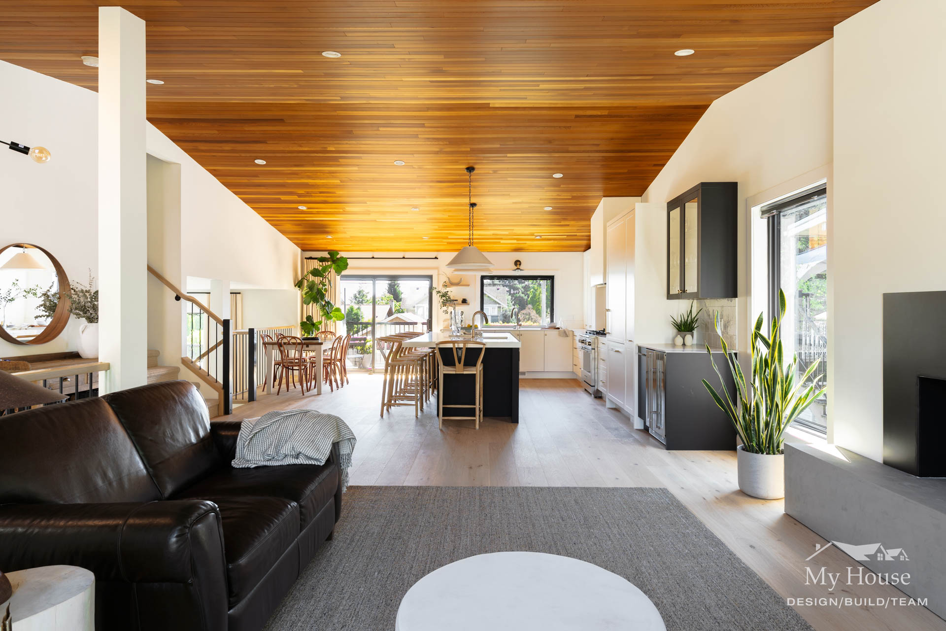 Our first step was to create an open living space by removing barriers between the kitchen and living room. This allows for uninterrupted flow and invites you to experience the beauty of the space. To bring everything together, we decided to embrace the charm of the past. The stained tongue and groove ceiling serves as a unifying element, drawing the eye upwards and creating a harmonious mix of natural materials and modern lines.