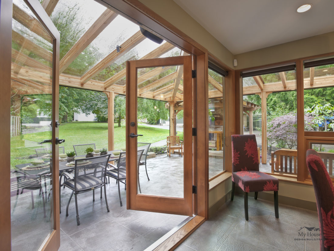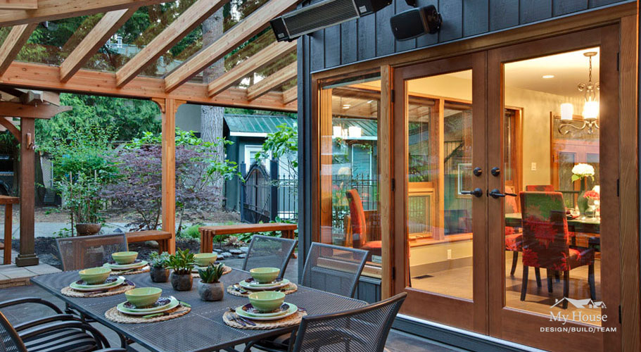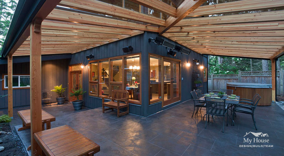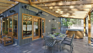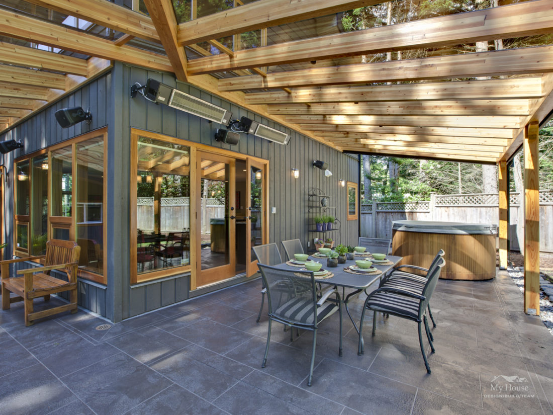 A glulam beam and glass roof canopy extend from the south and west corners of the house, creating a beautiful covered outdoor living space. Heaters and a fireplace, including a pizza oven, provide a wonderful outdoor living area that can be used all year long.